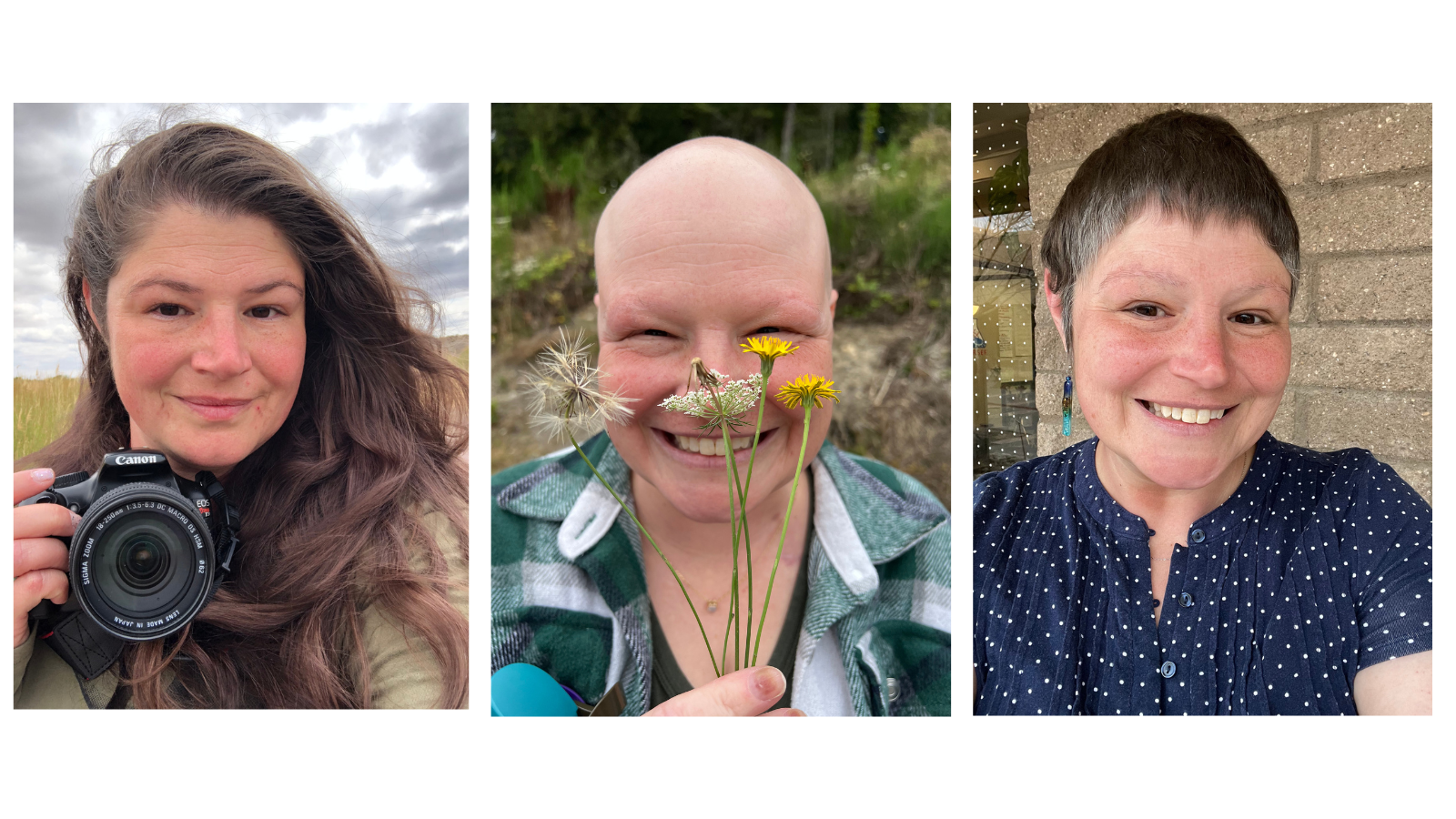 Image description : A three photo collage showing Birdability board member and blog author Julie Euber at different moments in her birding and cancer journey. In the first photo, Julie stands outdoors in an open landscape under a cloudy sky. She has long dark brown hair and holds a Canon camera up near her face, ready to photograph birds. The wind lifts her hair slightly and tall grasses stretch out behind her, suggesting a birding outing in a wide natural area. In the second photo, Julie is pictured during chemotherapy. Her head is bald and she smiles broadly while holding several wildflowers in front of her face, including a bright yellow dandelion and delicate white seed heads. She wears a green and white plaid shirt, and soft green vegetation fills the background. Her expression is joyful and playful as she lifts the flowers toward the camera. In the third photo, Julie smiles warmly in a close up selfie. Her hair has grown back into a short pixie cut. She wears a navy blue shirt with small white dots and stands beside a light tan brick wall.