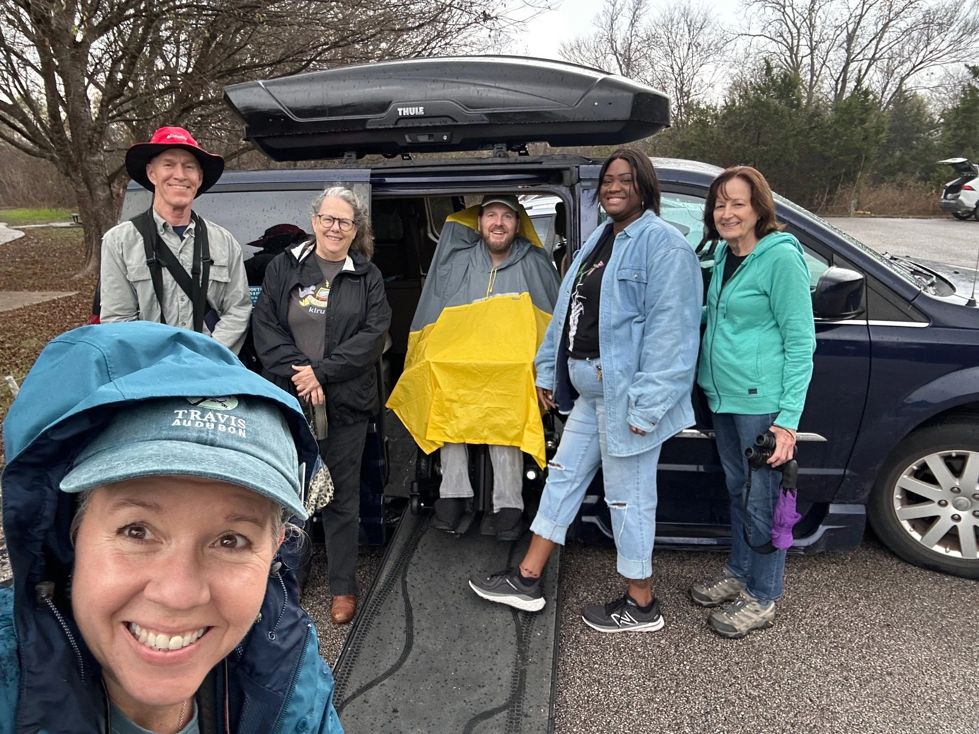 Image description: Eric Clow sits in his power wheelchair covered with a yellow and grey rain poncho at the top of the ramp to his accessible van as it sprinkles rain. His wheelchair left a pair of wet tracks up the surface of the ramp that are viible along with individual raindrops. Around him are five other folks who participated in a Birdability and Travis Audubon accessible CBC outing in Autin, TX.