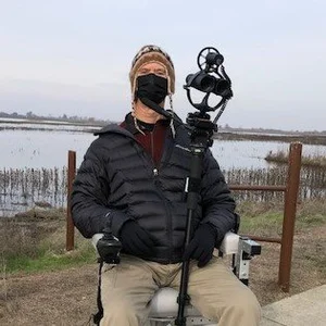 Currently I am using a wheelchair to bird. As this requires a special birding location, I have not participated in any group outings to date. My goal is to develop monthly accessible birding field trips through my involvement with Sacramento Audubon. The trips would be identified as specifically designed for birders with mobility issues, but open to all who want to attend. I’m hoping these outing materialize, and I can fully enjoy birding with a group.